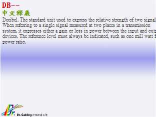 分貝。 用於表示兩個訊號相對強度的標準單位。 當指在傳輸系統中的兩個位置測量的單一訊號時,它表示輸入和輸出設備之間的功率增益或損耗。 必須始終註明參考水平,例如功率比為一毫瓦。
