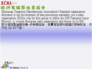 (歐洲的電腦製造商結合)--標準組織對資料處理標準的發展呈現; 不是一個商業體制。 ECMA 是給 OSI 傳輸階層協定下定義的第一個組。 一個發行的西方的歐洲商業體制它的對國際標準組織。