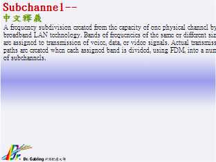 一個頻率再細分從寬頻區域網路科技的一個實體通路的容量創造。 一樣的或不同的尺寸的頻段對聲音、資料或影像訊號的傳輸是轉讓的。 當每個轉讓的帶被分開時,實在的傳輸路徑被建立,使用 FDM,進入一些次通道之內。